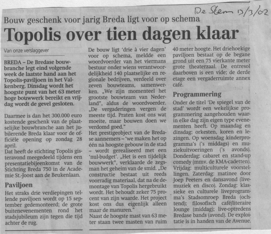 "Topolis over tien dagen klaar" (13-03-2002 BN/deStem)